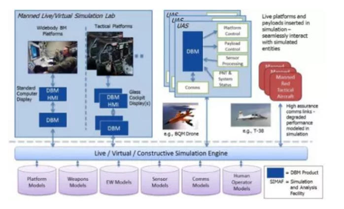 - 2018年1月,DARPA已向BAE系統(tǒng)公司授予DBM項目第三階段合同,前兩階段發(fā)展的成果能讓有人/無人機(jī)編組在干擾環(huán)境中飛行,具備回避威脅和攻擊目標(biāo)的能力。圖3是DBM項目的能力驗證環(huán)境。