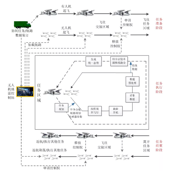 有人/無人機(jī)協(xié)同作戰(zhàn)典型作戰(zhàn)流程如圖10所示,共分成任務(wù)準(zhǔn)備階段、任務(wù)執(zhí)行階段和任務(wù)結(jié)束階段。